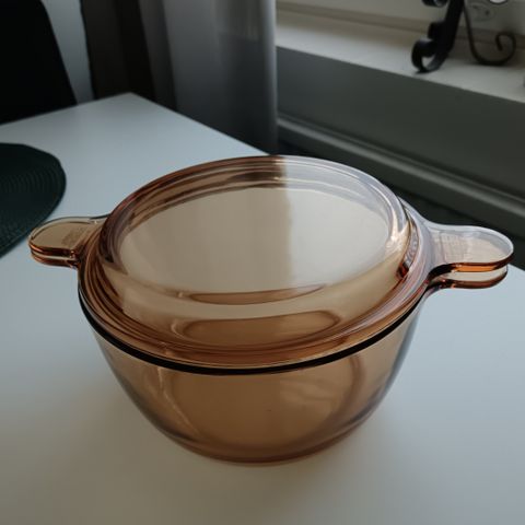 Hyväkuntoinen Vision lasipata kannella sopii niin uuniin, mikroon kuin liedelle. Tilavuus noin 1,5l
