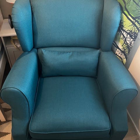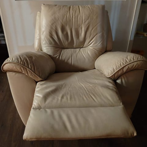 Toimii ja ehjä. Normaalia käytön jälkeä. Väjäytynyt hieman esim. käsinojista. Koiratalous.