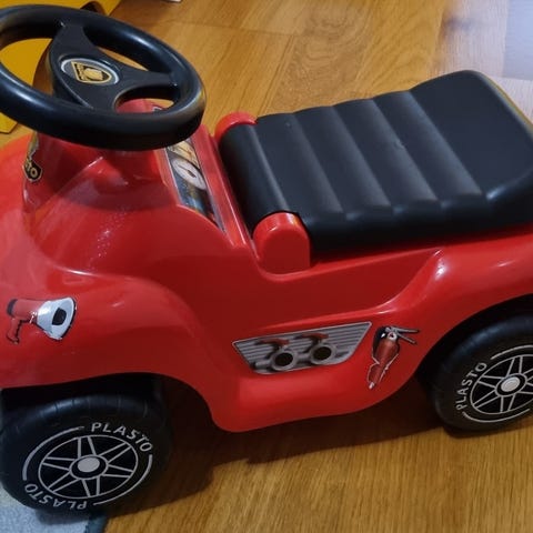 Plasto lasten punainen mopo. Yllättävän pitkään toiminut tällaisessakin kunnossa. Joutaa jo seuraaville ajajille.