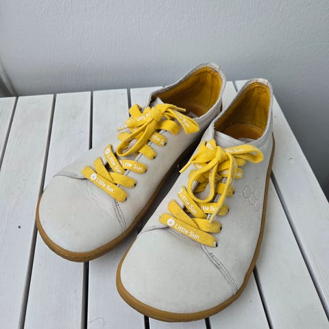 Uudet, vain sovitetut ja liian isoiksi todetut Vivobarefootin Primus lite knit -kengät koossa 41. Puhtaan valkoiset ja ihanan tuntoiset kengät jalassa, mutta omaksi harmikseni ovat kuitenkin liian isot minulle.