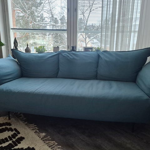 Verhoiluna tyylikäs harmaa Alcantara, joka tuo sohvaan ylellisen ja ajattoman ilmeen. Musta metallikehikko ja puiset jalat viimeistelevät kokonaisuuden.