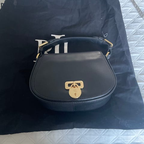 Kuvien mukainen käytetty musta laukku kultaisilla yksityiskohdilla. Normaaleja käytön jälkiä ja kulumaa nahassa.