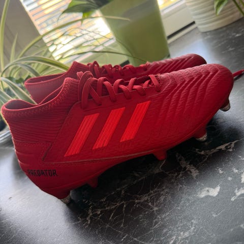 Adidas Predator jalkapallokengät, koko 29. Värit musta ja punainen. Valmistettu synteettisestä materiaalista. Sopivat jalkapalloon ja ulkokäyttöön. Sisämitta 175