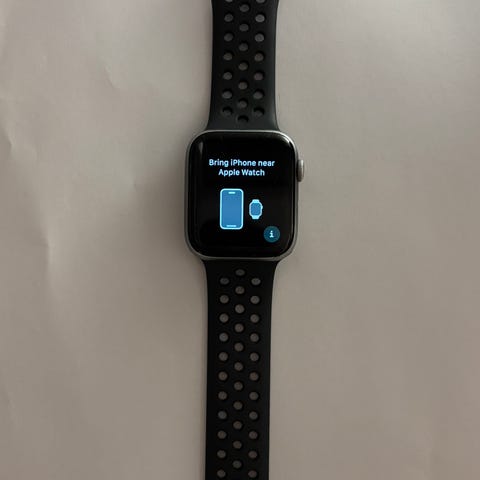 Apple Watch Series 4 älykello, jossa vaalea hihna. Ranneke pidempi malli, kokonaispituus 27cm päästä päähän.