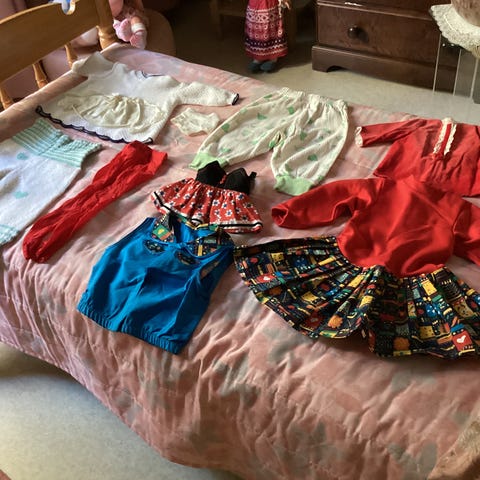 Nukenvaateita ps.kauniin vihreänsävyset on paita vaalean punainen, 34cm nukelle sopivat, tarrakiinnitys on paidassa, 32cm nukelle sopivat vaatteet, sekä nukenhoito välineitä, viimeisimmissä kuvissa oikea väri.