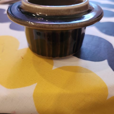 Arabia 1979 vuosiluvulla munakuppi, valmistettu keramiikasta. Munakupin koristeena on kukka- ja perhoskuviointi ruskean, mustan ja sinisen sävyissä. Valmistettu Suomessa.