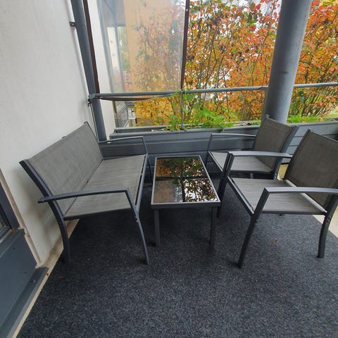 Lasinen pöytä, 2 tuolia, kahden istuttava sohva.