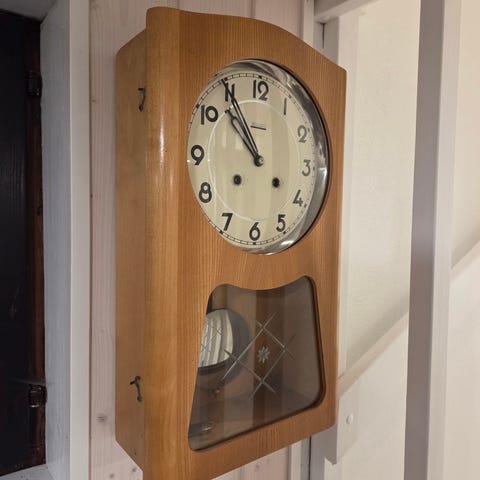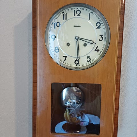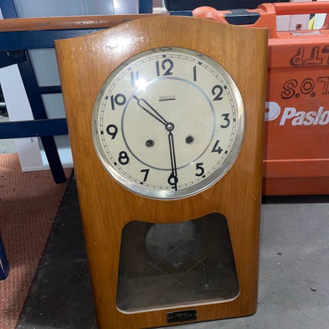 Täydellisesti toimiva vedettävä Valmet-seinäkello, suomalainen valmistus. Se lyö kerran puolelta ja tasatunnein niin monta kertaa kuin kello on. Kaunis sävel.