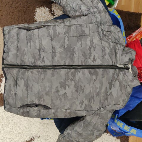 Takki on musta ja siinä on vetoketjulliset taskut sekä irrotettava huppu, jossa on tekoturkisreunus.
