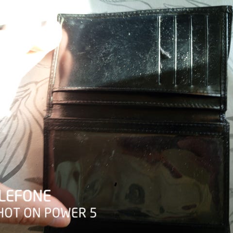 Suht vähällä käytöllä ollut lompakko eteenpäin, todennäköisesti keinonahkaa. Ostettu aikoinaan ihanaiset.com, merkki Disaster Designs. Viimeisissä kuvissa pikkuvirheet