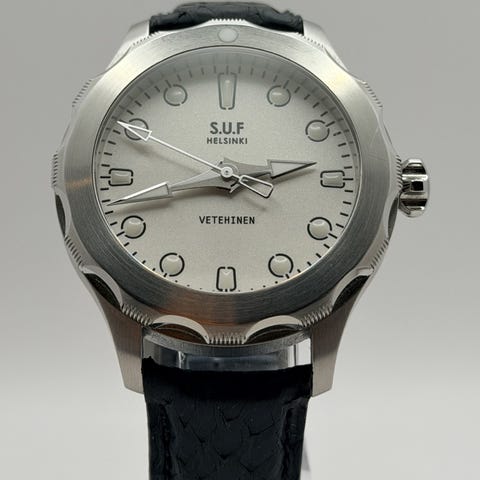 Huippukuntoinen kotimaista tuotantoa oleva S.U.F 180 Kelo Blue. Tämä kello sopii loistavasti niin arkeen, kuin juhlaankin. Kelloa on valmistettu rajoitettu 50 kappaleen erä ja tämä yksilö on 5/50.