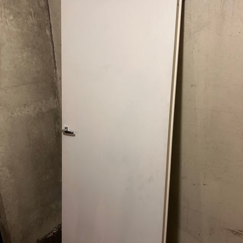 Valkea puinen sisäovi, jossa on kolme paneelia. Pinta erittäin kulunut. Musta kahva mukaan.