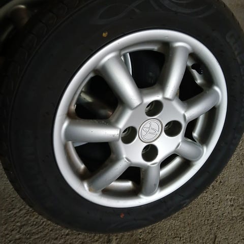 Toyota corollan alla olleet kesärenkaat peltivanteilla.