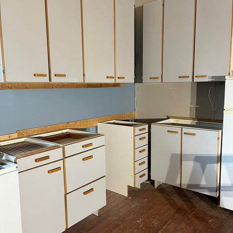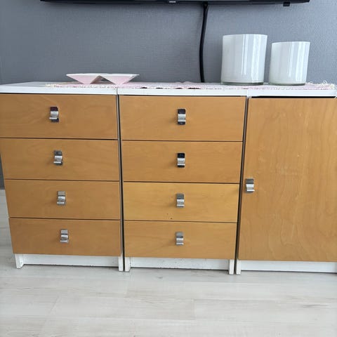 -laatikosto ja pieni kaappi, jonka ovesta puuttuu saranat, samaa sarjaa myös iso kaapin ovi (pelkkä ovi)