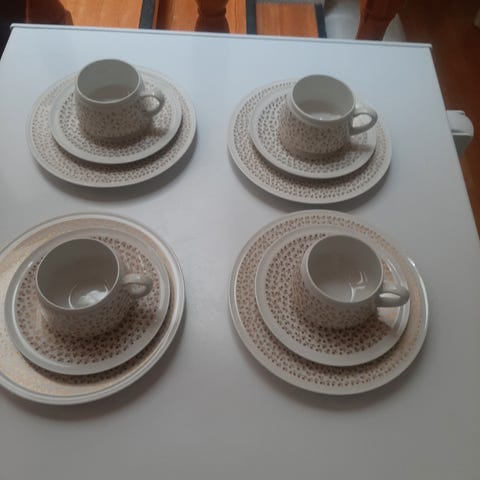 Arabia sarjan 2kpl Katinka kahvikupit, asetit ja pullalautaset. Suunnittelija Hilkka-Liisa Ahola tuotannossa 1965-1971. Astioissa pientä kulumaa.