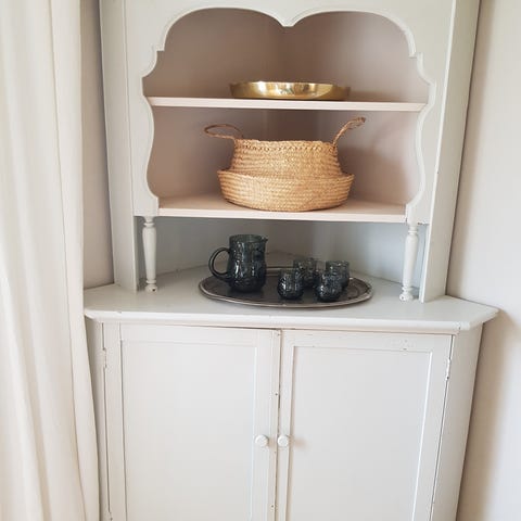 Valkoiseksi maalattu koivunen 1940-luvun kulmakaappi. Kaapin nurkkakulma on 90 astetta ja kulman viereiset sivut ovat 52 cm. Ulkonevat reunat ovat 25 cm, joiden väliin jää avohylly ja lukollinen kaappi, jossa yksi sisähylly. Toisen 52 cm levyisen seinäsivun takalevyyn on jätetty 50 cm x 23 cm aukko. Tämä tehtiin, jotta seinäpistorasioihin saatiin hyvin tv johto ja antennin johto. Aukko voidaan peittää ruuvaamalla siihen levy. Kaappi on minulla toiminut samassa paikassa Tv tasona. Kaapissa on säilytetty vain kirjoja ja vihkoja. Näin mielestäni kaapin maalipinta on säilynyt erittäin hyvin, ei kulumajälkiä. Minusta kaappi harvinainen löytö, josta luovun tilojen uudelleen järjestelyjen takia. Voit tehdä myös oman tarjouksen. Nouto