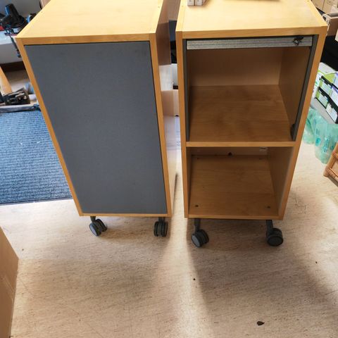 Pieni säilytyskaappi, jossa on harmaat sivut ja vaaleanruskea etuosa. Kaapissa on yksi vetolaatikko ja yksi ovi, jotka tarjoavat säilytystilaa. Kaappi seisoo neljällä jalalla ja soveltuu esimerkiksi kylpyhuoneeseen tai toimistokäyttöön.