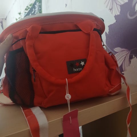 Tosi vähän käytetty harjakassi. Tummansininen, punaiset kantit. Monta lokeroa ulkopuolella ja sisällä vetoketjullisen tasku. Kantokahvat ja pidempi olkahihna.