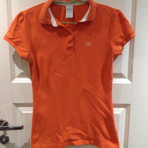 Helly Hansen pikeepaita, kokoa S. Paita on punainen ja siinä on kaulus sekä napitus.