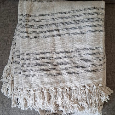 Vihreän eri sävyillä kuvioitu torkkupeitto. Materiaali 100% villaa.