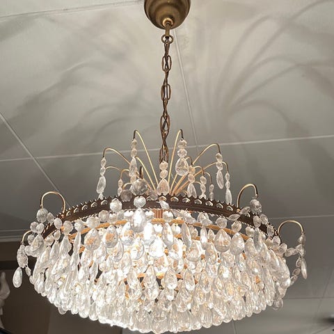 Kynttelikön väri on vaaleansävyinen kulta. Mitat; kynttelikön korkeus on katosta mitattuna n. 95 cm
