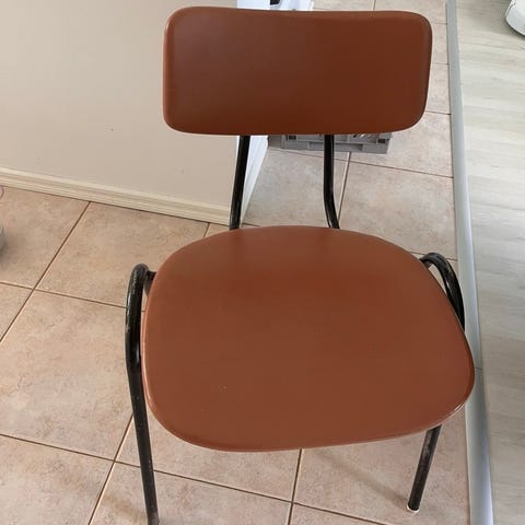 Kaksi koulutuolin kaltaista tuolia, jossa puu osuus päällystetty keinonahalla.