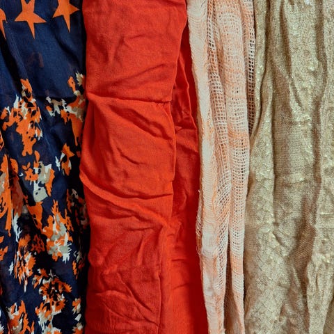 Striped one: I don't recall the brand, but it is a soft scarf with a cashmere mix.