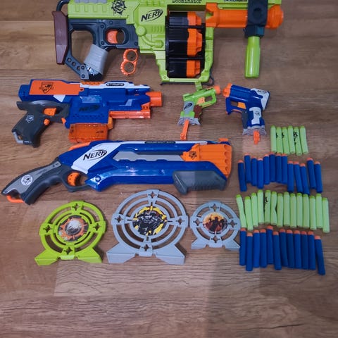 Nerf leikkipyssyt eri malleja ja värejä. Lisäksi myös yksi X-Shot -pyssy. Suuri määrä panoksia. Kaikki ehjiä.