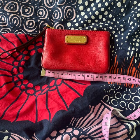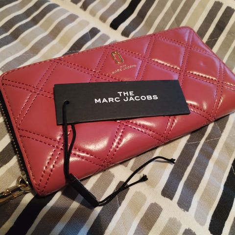 Marc Jacobs nahkainen lompakko, väriltään punainen. Lompakossa on vetoketjukiinnitys ja useita korttipaikkoja. Vetokerjun ”nipsu” puuttuu.