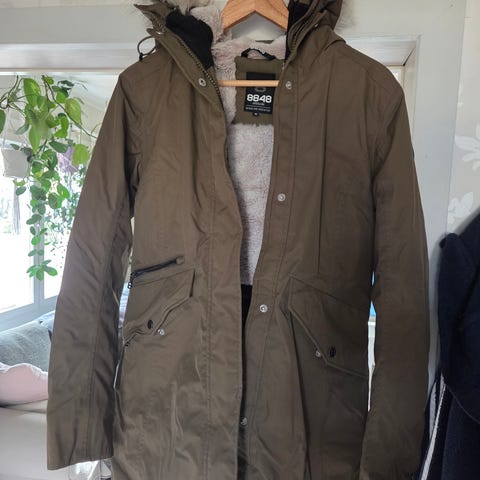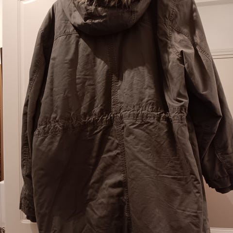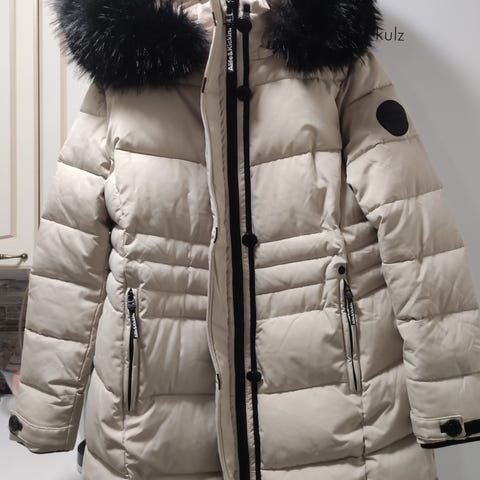 Uusi lämminvuorinen talvitakki. Valkoinen karvavuori on etu- ja takakappaleessa, hihoissa pelkästään vanua kankaiden välissä. Kuvan malli on kokoa xs/s