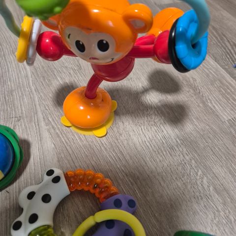 Käytettyjä, mutta ehjiä ja siistejä vauvaleluja. Osa helisee tai rapisee. Löytyy helistintä ja purulelua. Vedettävä ankka pitää "naksuvaa" ääntä.