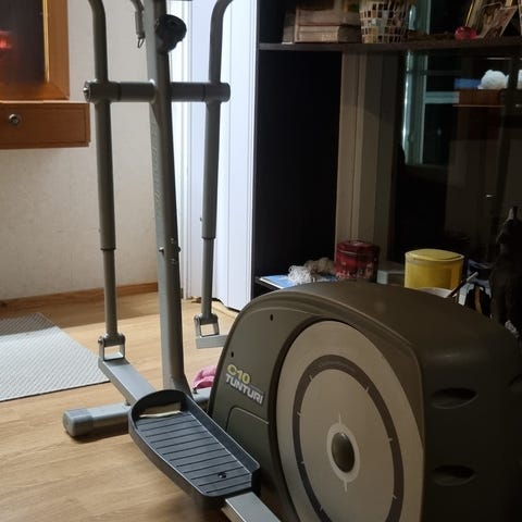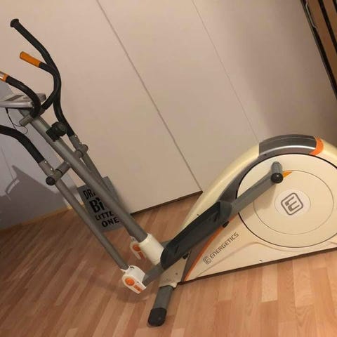 Kuntopyörä, jossa harmaa runko ja oranssit kahvat. Näyttö mykkä. Sopii kotikäyttöön kuntoiluun ja kestävyysharjoitteluun.