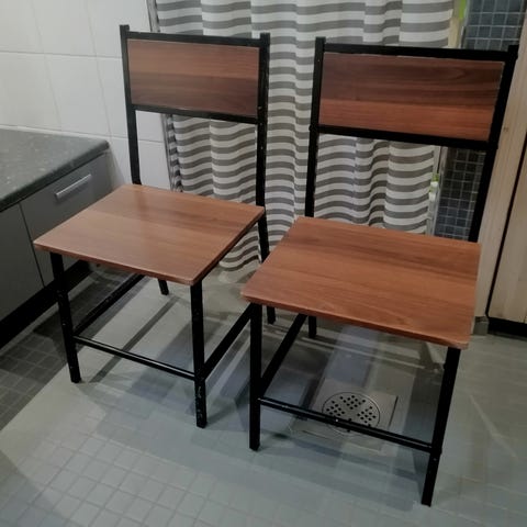 Annetaan tukeva valkoinen tuoli missä metalliset jalat ja käsinojat sekä muovinen istuinosa. Istuimen toinen reuna on naarmuuntunut ja on siksi väriltään tummempi. Ei haittaa käyttöä mutta ehkä jos haluaa niin sen voi maalata.