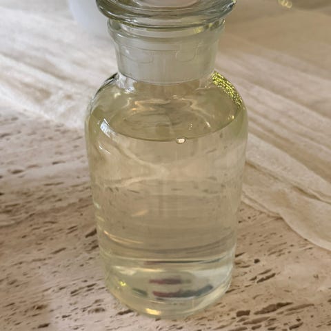 Lasinen pullo, jossa on metallinen lukittava kansi ja muovinen hana. Pullo on suorakulmainen ja läpinäkyvä, soveltuu nesteiden tarjoiluun ja annosteluun.