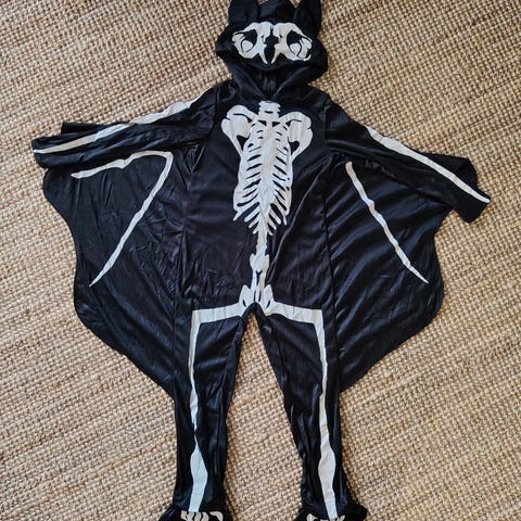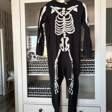 Lasten unisex luurankopuku, jossa musta ja violetti väriteema. Puvussa on luurankokuviointi ja violetti tyllihameenomainen yksityiskohta vyötäröllä. Sopii esimerkiksi juhla- tai naamiaiskäyttöön.