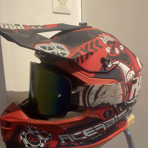 moottoripyöräkypärä, koko M. Väri musta ja valkoinen. Sisävuori hengittävää materiaalia. Kypärässä kirkas visiiri ja kiinnityshihna.