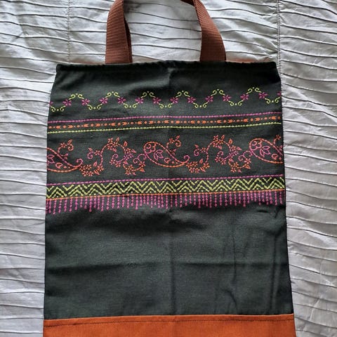 Myydään tyylikäs ja kestävä kangaskassi, koko 39 × 38 cm, hihna 61 cm. Materiaali on paksua ja laadukasta kangasta, joka kestää hyvin käyttöä. Kassi on ollut käytössä vain pari kertaa ja pesty ennen myyntiinlaittoa. Väri on tummanharmaa (ei täysin musta), ja kuosissa on hauska, eläväinen kuviointi.