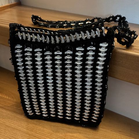 Myydään sievä ja käytännöllinen itse tehty olkalaukku, koko 18 × 20 cm, hihna 122 cm.
