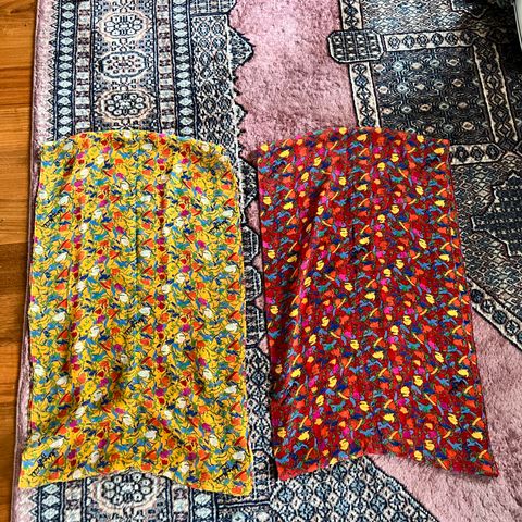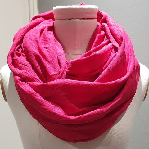 Hailakan vaaleanpunainen huivi, jossa valkoisia kuvioita. Ohkaista materiaalia.
