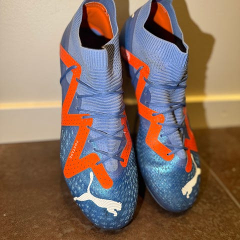 Puma Future 7 Ultimate FG/AG jalkapallokengät sinisessä värissä. Kengät ovat kokoa 42 ja soveltuvat luonnon nurmelle ja keinonurmelle. Materiaalina on synteettinen kangas, jossa on joustava ja hengittävä yläosa. Kengissä on nappulapohja, joka tarjoaa hyvän pidon kentällä. Kunto on kohtalainen. Kantapäiden pehmusteet kengän sisällä ovat revenneet, mutta ne voi korjata tarrapaikalla. Kenkien hinta uutena on 240€.