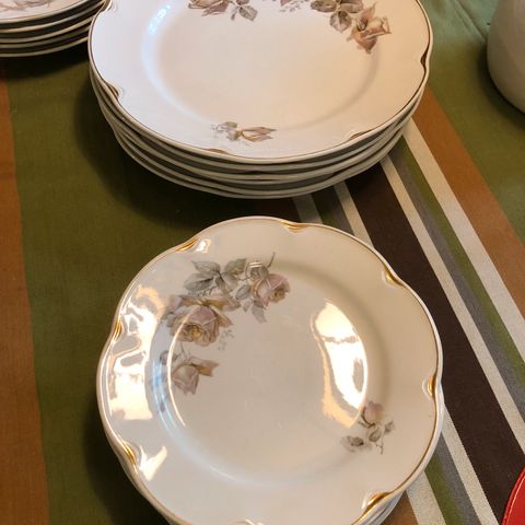 Hyväkuntoinen Arabian Diamant astiasto. Syvät ja matalat ruokalautaset 6+6 kpl. Salaatti- ja leipälautaset 5+5 kpl ja muut kuvissa näkyvät astiat.