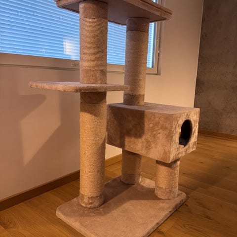 Erittäin laadukas, täysin ehjä ja todella tukeva teline kissoille, ei keikahda vaikka useampikin iso kattivatti siellä makoilisi.