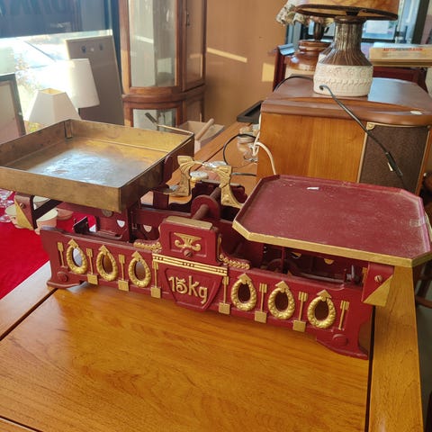 Antiikkinen vaaka, valmistettu metallista ja puusta. Sisältää ison vaakalautasen ja mekaanisen mittausmekanismin.