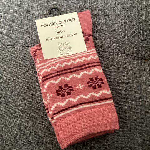 Polarn O. Pyretin jarrusukat, koko 31/33. Laitimmaiset raidalliset sukat enemmän käytetty, loput jääneet vähälle käytölle. Hinta koko setille (6 paria).