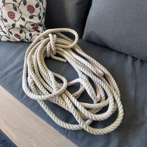 Pitkä valkea kiinnitysköysi. Pituus n. 44 m ja halkaisija n. 12 mm. Käyttämätön.