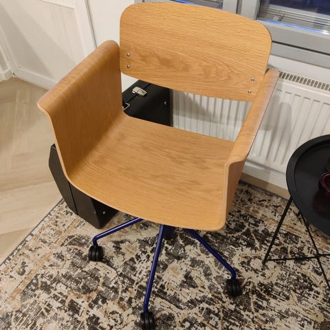 Tuoli pyörii, ja pöydän voi siirtää sivuun käytön mukaan.
