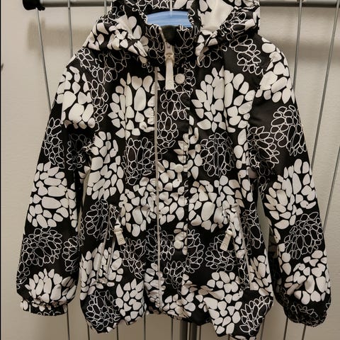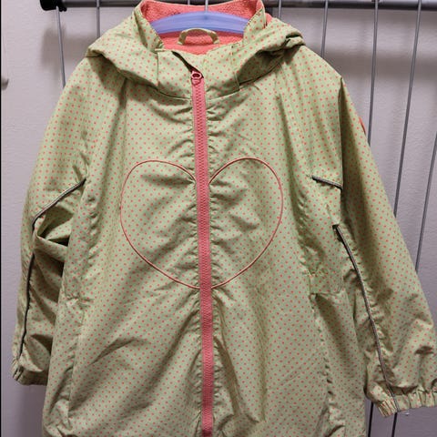 Iloisen värikäs ReimaTec-takki kokoa 116 (reilu mitoitus). Kaunis koralli väri ei näy täydellisesti kuvissa, myös tummemmat kuviot eivät livenä hyppää silmille kuten kuvissa. Erittäin hyväkuntoinen, myös värikkäät somisteet kuten nepparit, vetimet ja olkamerkki hyvässä kunnossa.