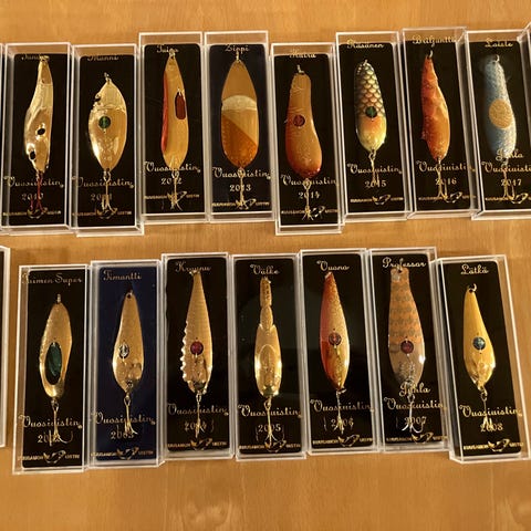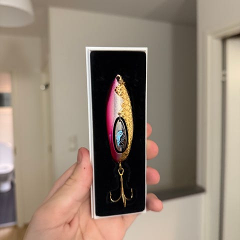 Koriste-esineenä ollut, ei käytetty järvessä. Itse uistin uudenveroinen, mutta kotelossa hieman naarmuja.