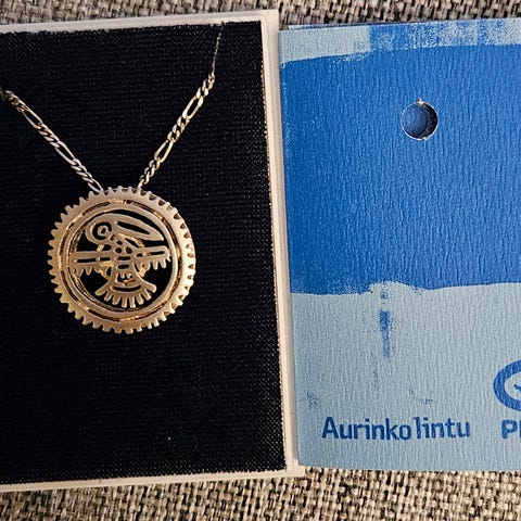 Mikko Kuustosen Plan internationille suunnittelema hopeinen Aurinkolintu -koru alkuperäisessä pakkauksessaan. Korussa on musta pitkä nyöririipus. Korun takana on kiinnitetty Plan kummilapsen itse keräämä kivi. Riipuksen halkaisija on 3,5cm.