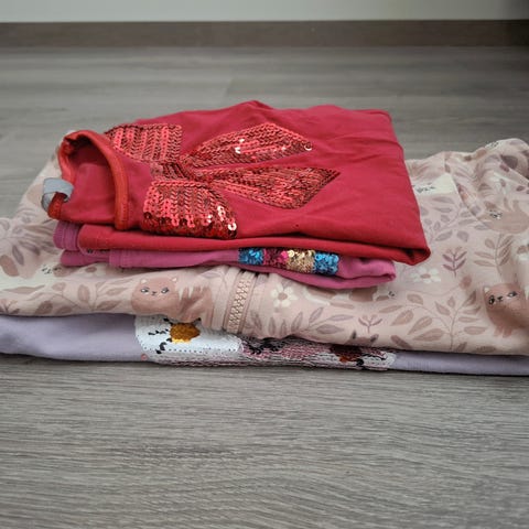 Neljä paitaa: Lindexin ruskea ribbipaita 116, erittäin hyväkuntoinen. Lindexin leoparditunika 116, hyväkuntoinen. Lindexin peplumtakki 110/116, OK kunto (hieman kulunut, pieni huomaamaton sininen tahra edessä). Name itin huppari 116, hyväkuntoinen.